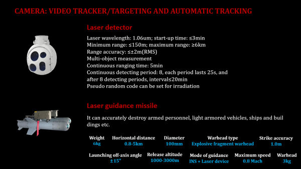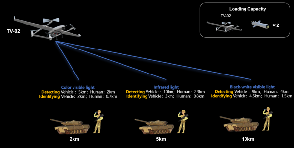 Equipped with electro-optical and infrared sensors, the TV-02 can conduct all-weather, day-and-night surveillance. It is also armed with lightweight precision-guided munitions, enabling real-time engagement of targets once identified.